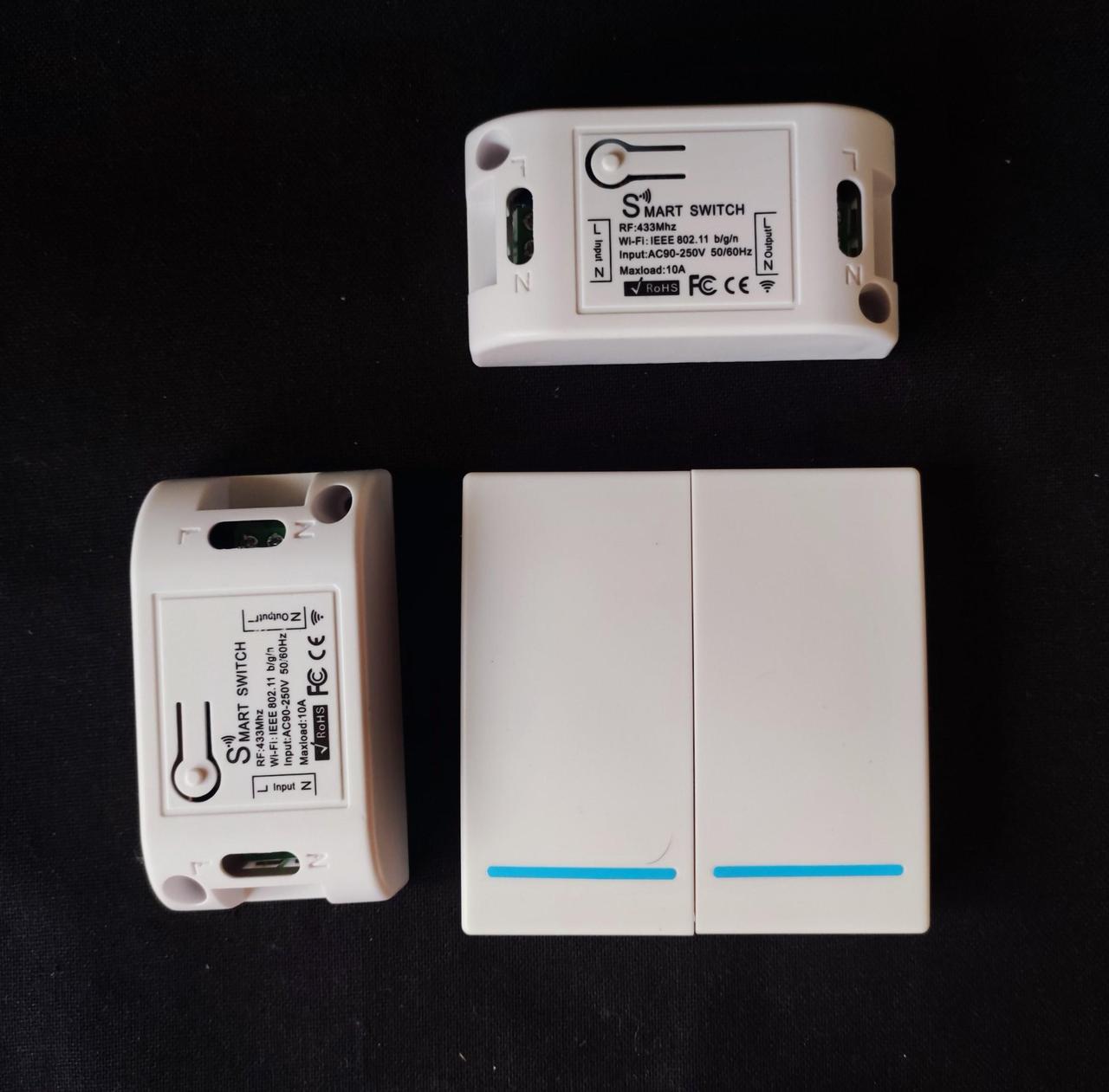Комплект - беспроводной выключатель двух клавишный радио 433Mhz белый с флуоресцентной подсветкой и два радиореле с поддержкой Wi-Fi предназначен для управления беспроводным способом (радиоканал) освещением, приводами жалюзи или ворот и иными электрическими приборами, с поддержкой Алисы