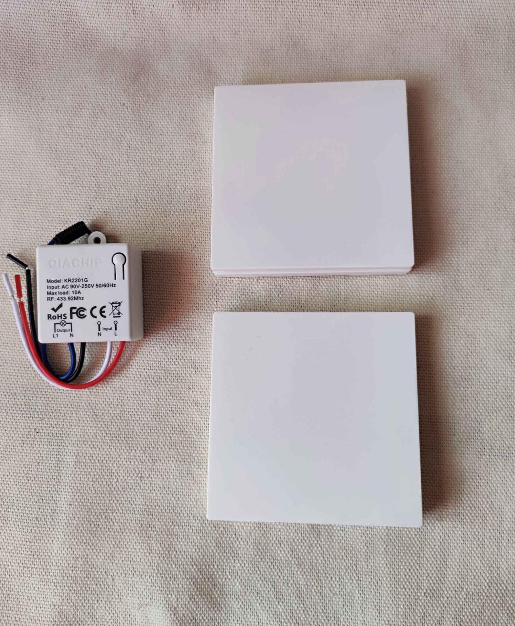 Две белые одноклавишные панели дистанционного управления, предназначенные для настенных выключателей, поддерживают стандарт RF433 MHz и используются вместе с радиореле (входит в комплект) в качестве проходного выключателя