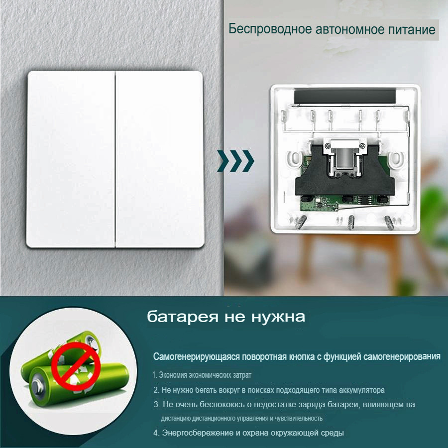 Панель дистанционного управления не нуждается в батарейках, имеет влагозащиту и компактные размеры 86*86*19 мм, устанавливается на двухсторонний скотч в удобном месте и управляет радиореле (ставится в разрыв питания светильника) по радиоканалу. Использует уникальную технологию сбора энергии. Когда Вы нажимаете кнопку, модуль преобразования энергии внутри преобразует кинетическую энергию в электрическую. Затем беспроводной модуль кнопки отправляет сигнал на приемник. Приемник получает сигналы и включает / выключает свет. Щелк, и свет горит. Причем без каких либо батареек. Выключатель сам можно хоть на кровати повесить) В общем очень гармоничный внешний вид и безумно удобно.